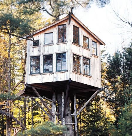Any kid in Bridgton , Maine , would want to have Peter Lewis's playhouse in his backyard. And no wonder. Lewis has tricked it out with a drawbridge and two spiral staircases. Best of all, the whole thing floats 21 ft. off the ground. Lewis, however, is no kid, and his masterpiece--a two-story, 6000-pound clubhouse slung from an Eastern white pine--bears scant resemblance to the banged-together shacks of childhood. His treehouse is held aloft by a well-engineered suspension system that imparts nary a scratch to the pine's bark. Hearty beams and mortise-and-tenon joints lend built-for-the-ages solidity. Weather-sealed windows, insulation and a coal-burning stove deliver year-round enjoyment, even in icy Maine .